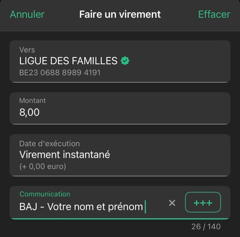 Pour valider définitivement votre réservation , merci de verser votre participation sur le compte bancaire BE23 0688 898 941 91 de la Ligue des Familles en mentionnant la communication suivante : BAJ – Votre nom et prénom. Merci d’avance de privilégier un paiement instantané afin de limiter le temps de traitement.